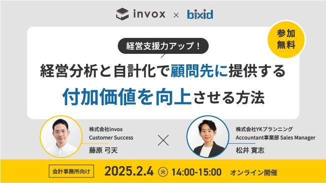 経営判断の“次の一手”を加速させる経営支援クラウド『bixid(ビサイド)』を提供する株式会社YKプランニング(本社:山口県防府市、代表取締役社長:岡本辰徳)は、株式会社invox(本社:東京都新宿区、代表取締役:横井 朗)と共同で、会計事務所向けに「経営分析と自計化で顧問先に提供する付加価値を向上させる方法」セミナーを2月4日(火)14時よりオンライン開催いたします。