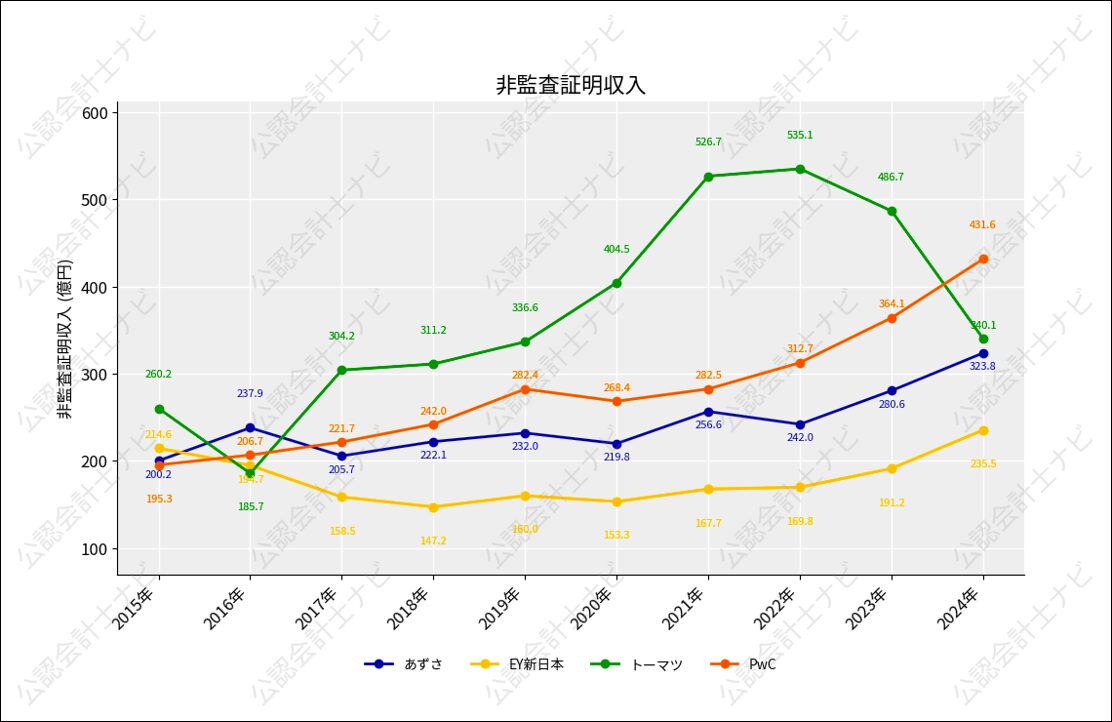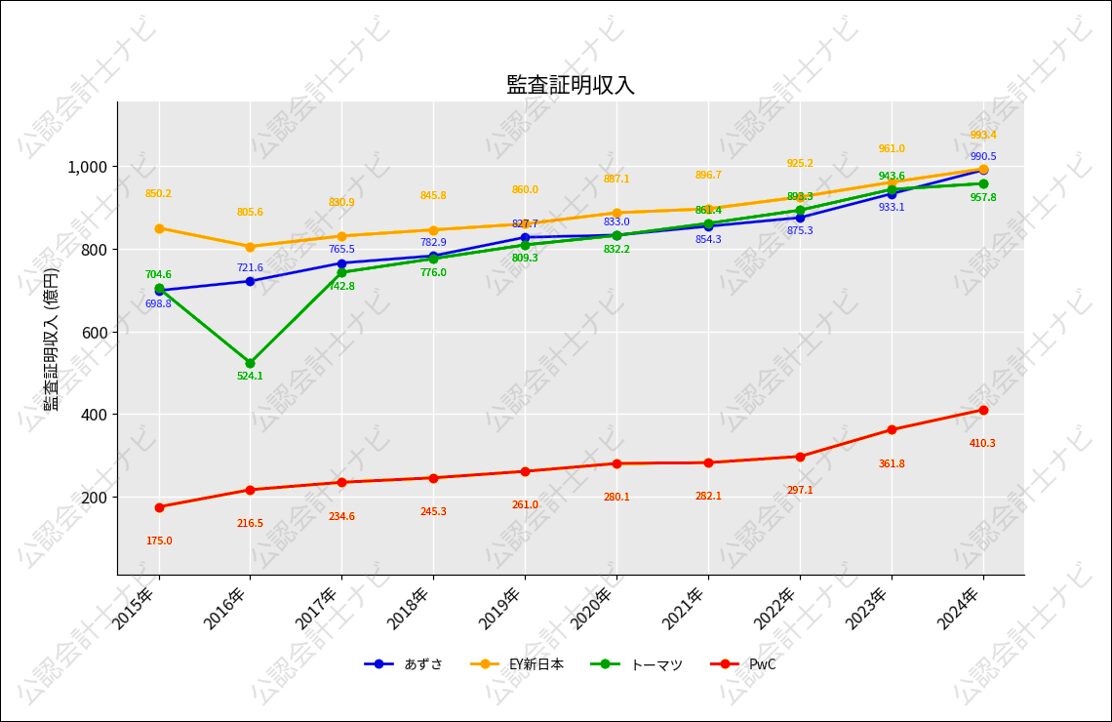 「監査証明収入」については、4法人すべてが前期比で増収を達成しています。トップ3は990億円台で激しく首位を争っており、24年度もEY新日本が僅差でトップを維持したものの、2位との差は縮まりました。
