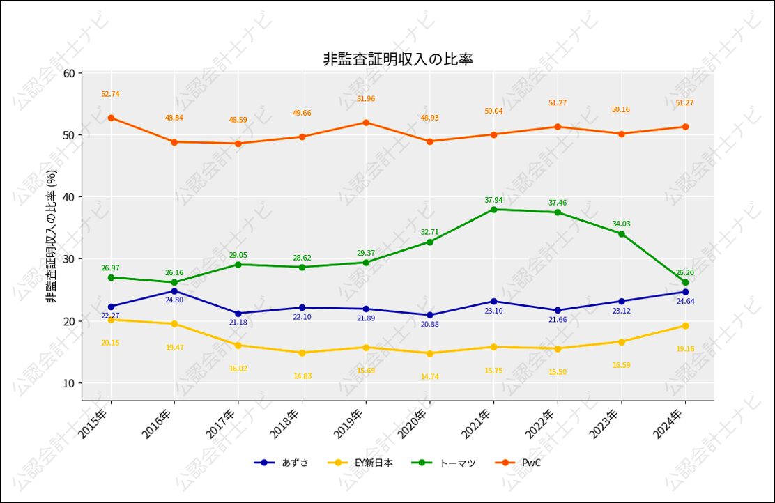 「非監査証明収入の比率」は、PwCが引き続き50%を超える圧倒的に高い比率を維持しました。トーマツは組織再編もあってか急低下。あずさ・EY新日本は20%前後で推移しながらも比率を高めています。