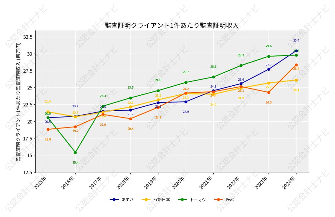 PwCは単価を急激に上昇させました。EY新日本はクライアント数が多いこともあってか、単価は最も低くなっています。