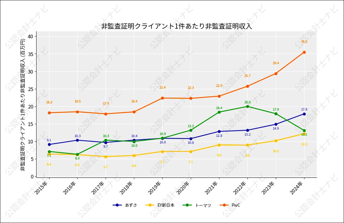 次に、クライアント1件あたりの業務収入を監査証明と非監査証明に分けて見てみましょう。