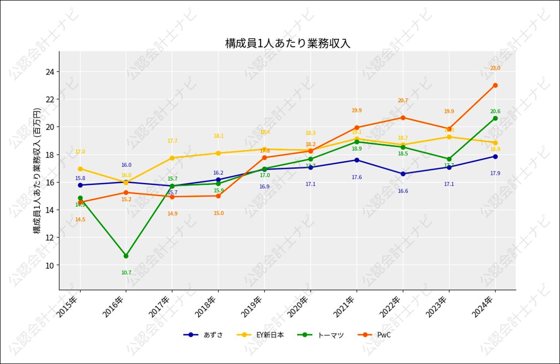 「構成員ひとりあたり業務収入」は、PwCが約2,300万円と最も高い数値を記録しました。トーマツは組織再編による人員減が寄与してか、2,000万円台へ急伸。EY新日本は人員の大幅増があったものの微減で済みました。あずさは堅調に数値を伸ばしています。