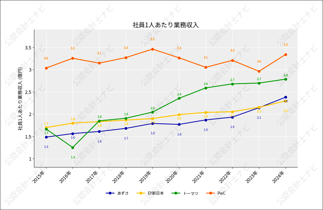 PwCの業務収入は842億円と最小ではあるものの、営業利益は17.7億円でダントツの首位。営業利益率も2.11%と、他社を圧倒する結果となりました。非監査収入比率が51.27%と高く、ここで稼ぐビジネスモデルが確立されています。社員1人あたりの業務収入(約3.3億円)も高く、「稼ぐ力」の高さが窺えます。