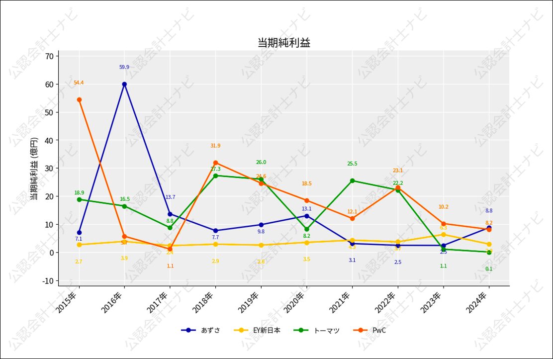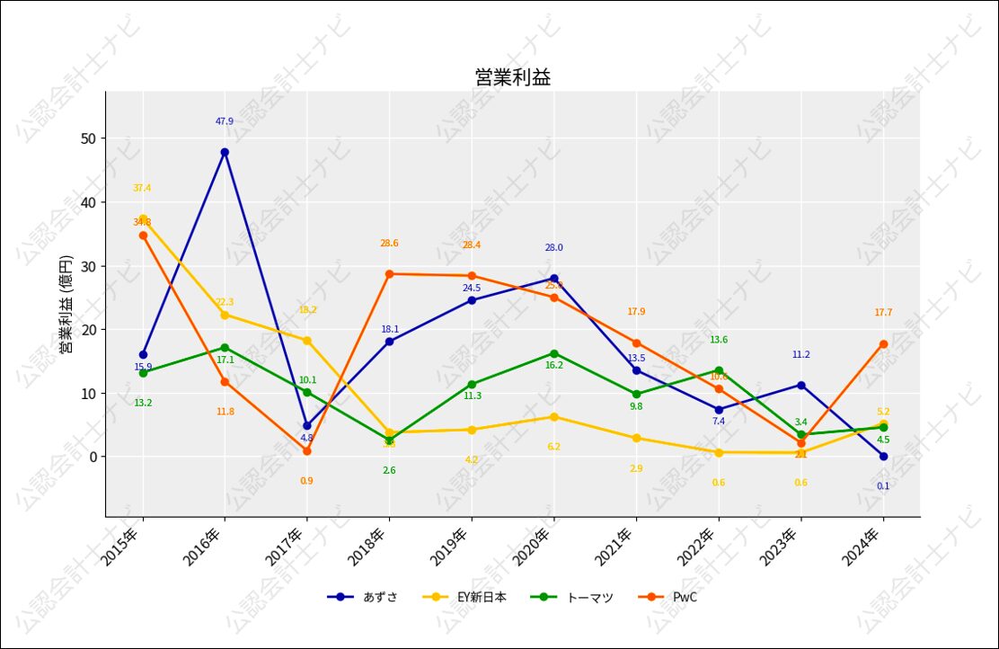 PwCが17億円を超える営業利益を計上し、他3法人を圧倒しています。一方であずさは前期の11.2億円から0.1億円へ激減、EY新日本は0.6億円から5.2億円に。トーマツは3.4億円から4.5億円へ増益しています。