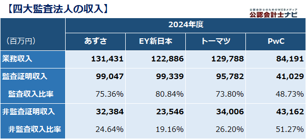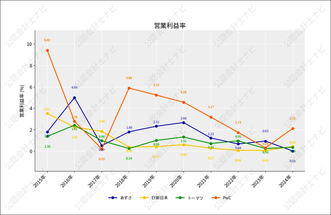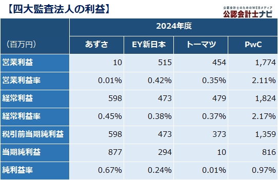 業界全体で増収基調にあるものの、営業利益率は0.01%〜2.1%という低い水準に留まりました。監査法人は「売上は巨大だが、利益はほとんど残らない」という構造的な苦境に立たされているのかもしれません。