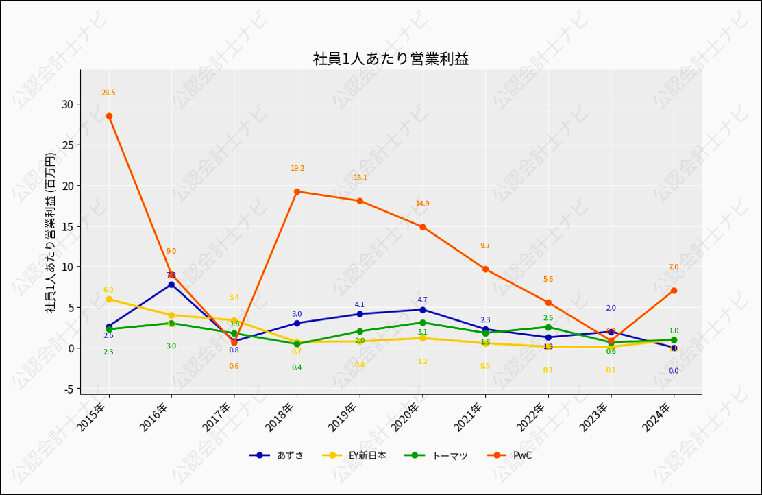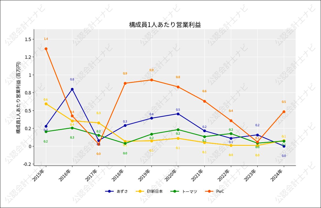 「構成員1人あたり営業利益」でもPwCが0.5百万円でトップに躍り出ました。一方であずさは0.2百万円から0.0百万円で最下位に。業界全体として、ひとり稼いでも利益がほとんど残らない「超・薄利」の構造が鮮明になっています。