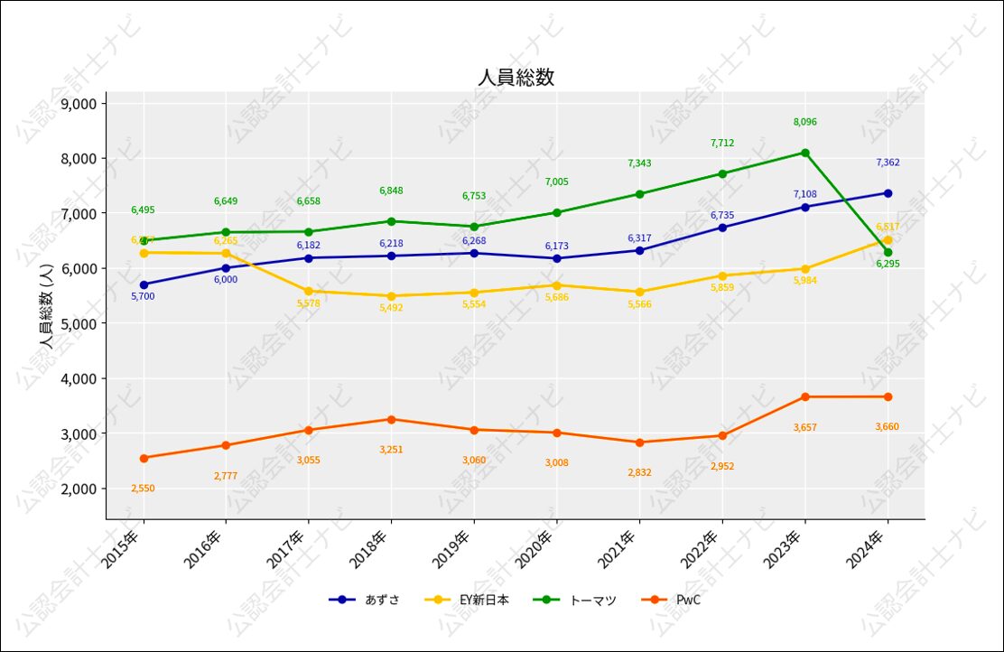 監査法人各社の「人員総数」を2015年からグラフにしました。