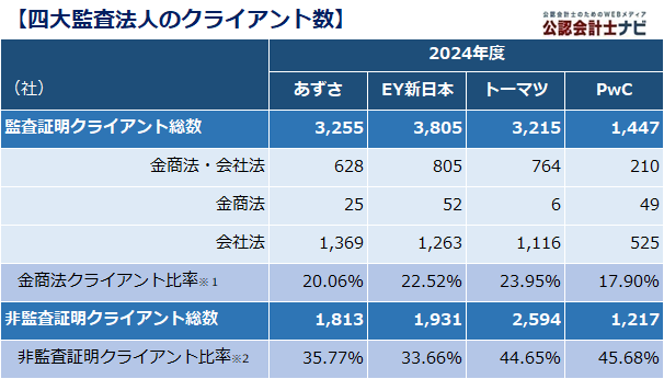 以下は、2024年度の監査証明と非監査証明のクライアント数やその比率です。