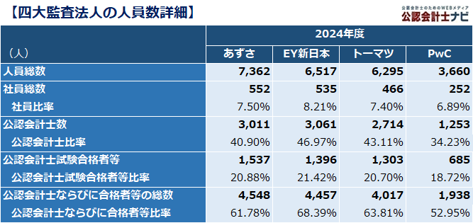 まずは四大監査法人の「人員」を比較してみましょう。以下は各法人の24年度の人員数の詳細です。
