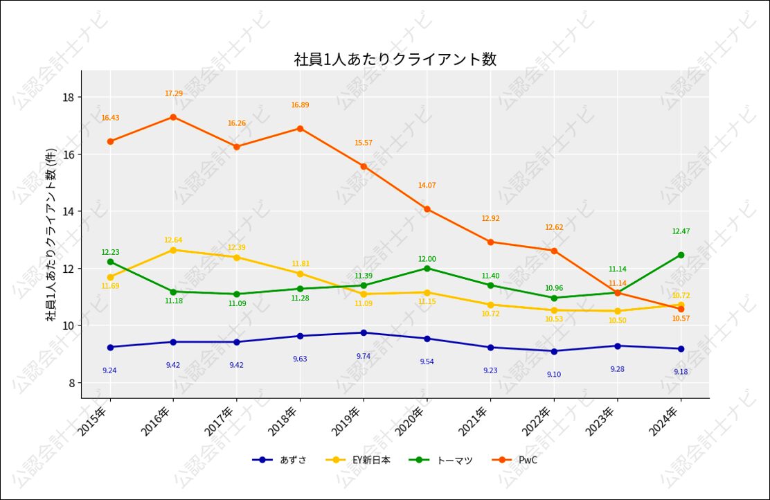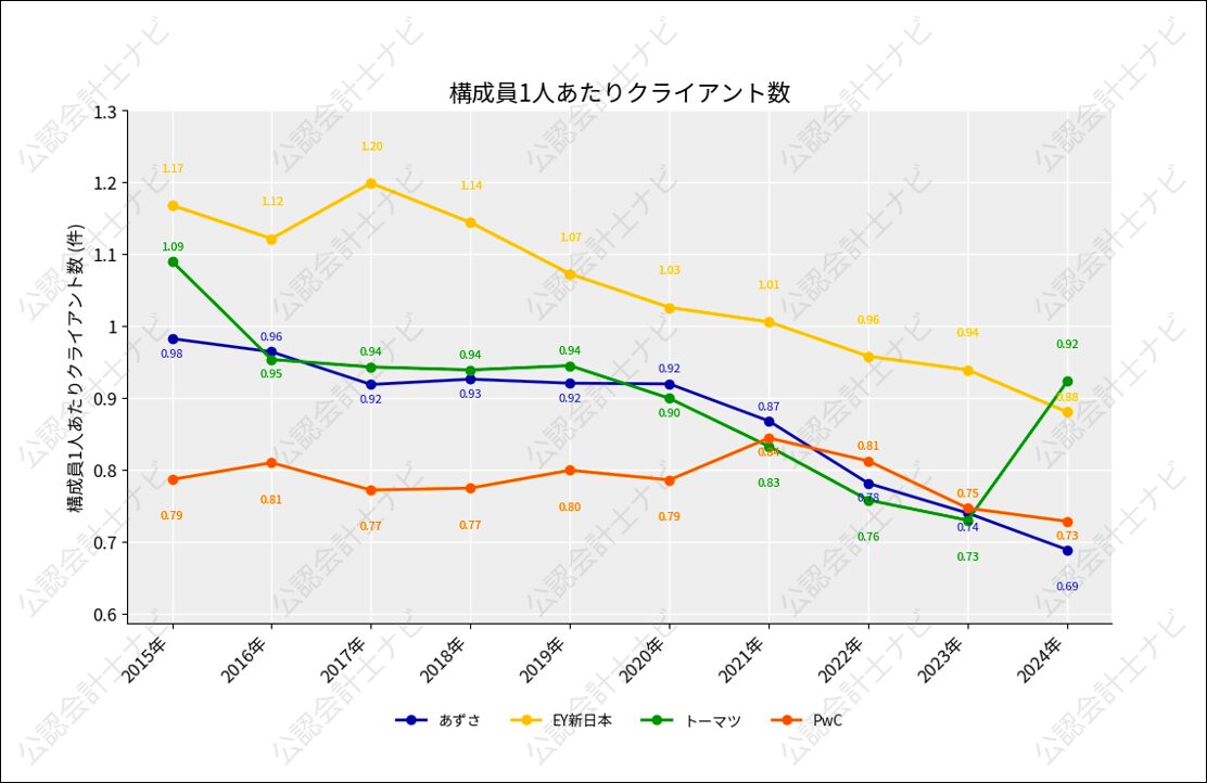 トーマツが、組織再編による人員減により「構成員1人あたりクライアント数」で0.92件となり、トップとなりました。他の3社は減少傾向が続いています。