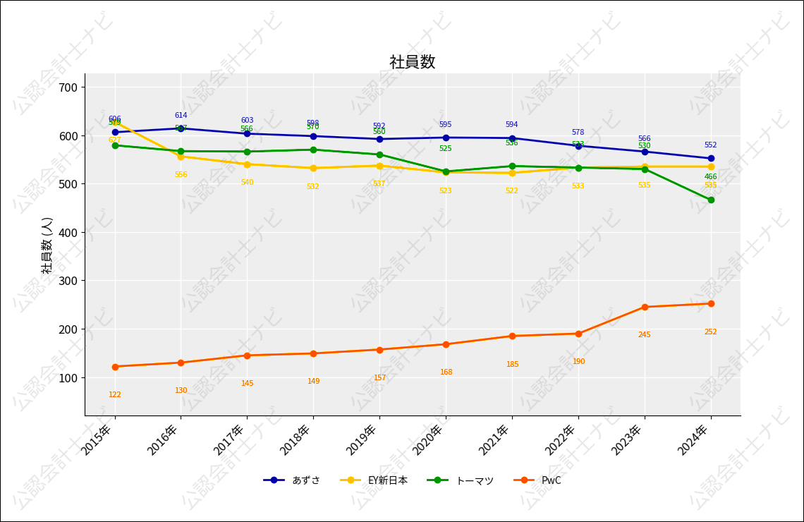 以前は、PwCとその他3法人で社員比率が2倍前後違いましたが、その差が縮まってきています。