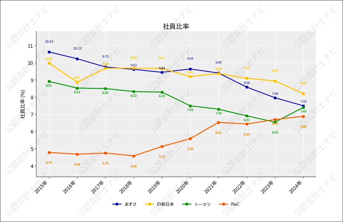社員比率については、トーマツが上記の組織再編の影響もあり、人員総数が大幅に減少した結果、前期6.55%から当期7.40%へ0.85%増加しています。EY新日本とあずさは減少傾向、PwCの上昇傾向は24年度も継続しました。