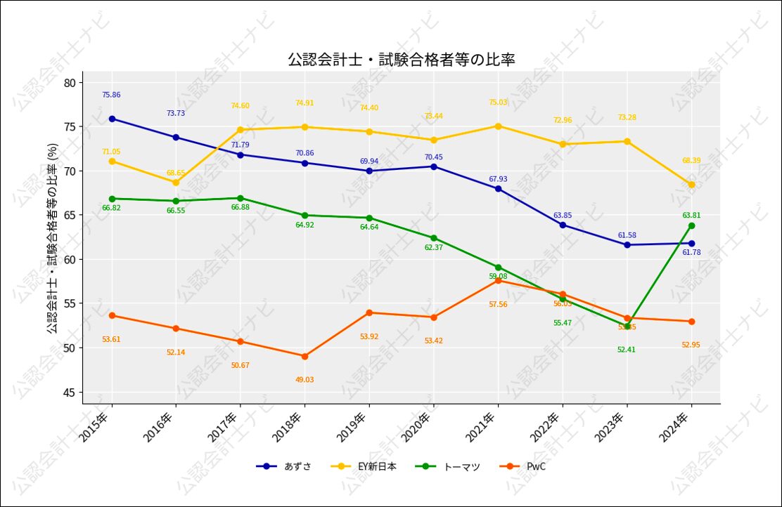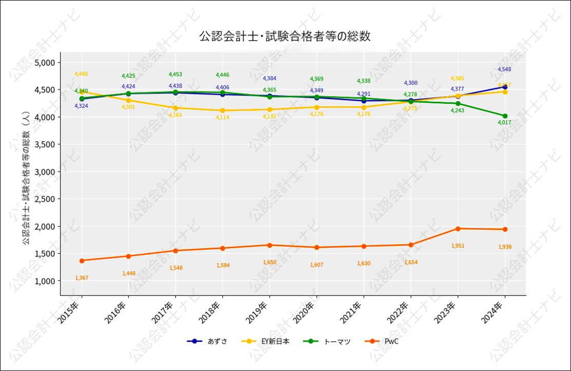 「公認会計士ならびに合格者等の比率」においても、トーマツの組織再編の影響は大きいのがわかります。あずさは2015年から長期的に減少傾向でしたが、23年度から24年度にかけてはほぼ横ばいでした。PwCは微減です。