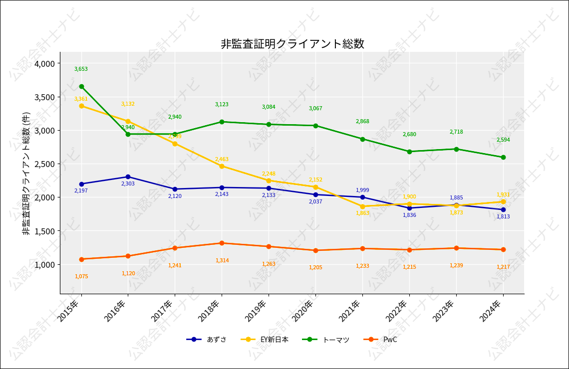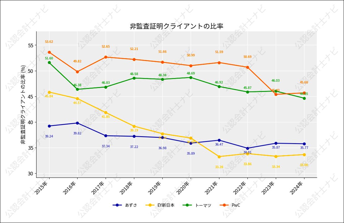 また総数の減少により、非監査証明クライアントの比率も減少。PwCと順位が入れ替わっています。あずさとEY新日本はここ数年の横ばい傾向が継続しました。