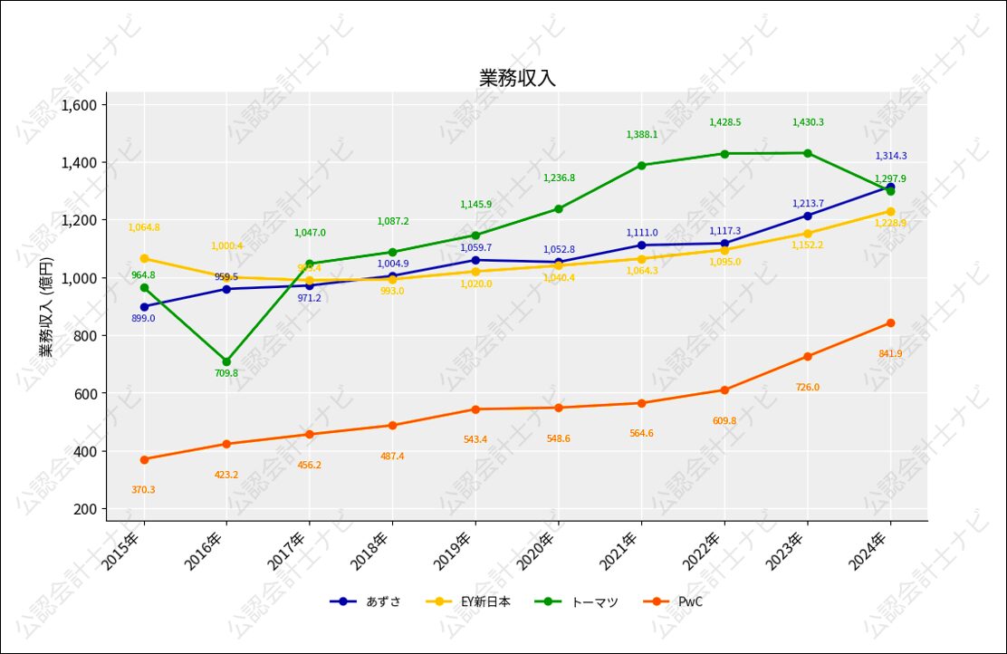 業務収入はトーマツのみ減少、他法人は増加しています。この結果、23年度から順位が入れ替わり、1位あずさ、2位トーマツとなりました。3位と4位は変わらず、EY新日本、PwCです。