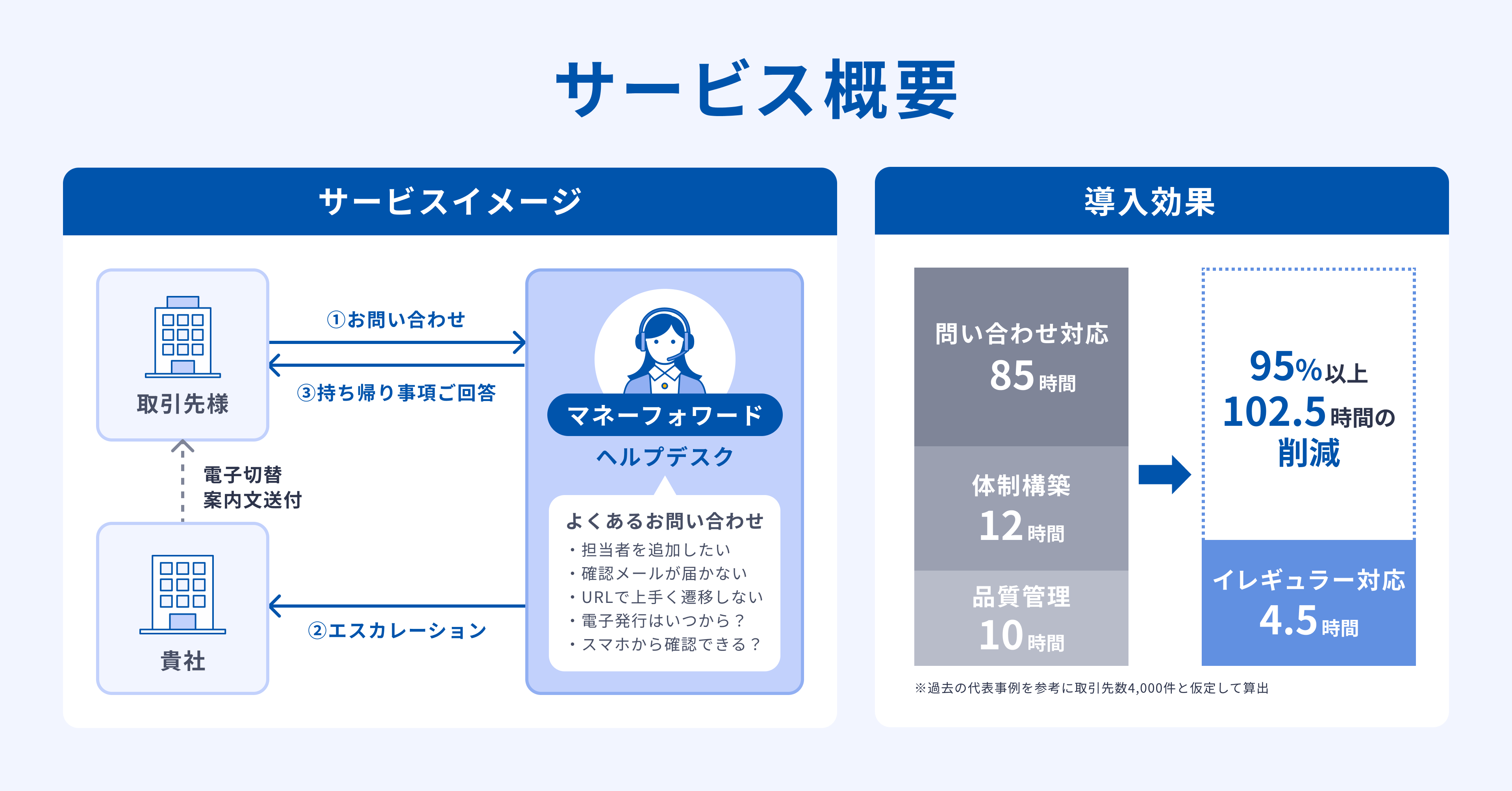 「ヘルプデスクオプション」は、『マネーフォワード クラウドインボイス』のユーザーに寄せられる、取引先からの電子請求書への切り替えや利用方法に関する問い合わせ対応をマネーフォワードが代行するBPOサービスです。