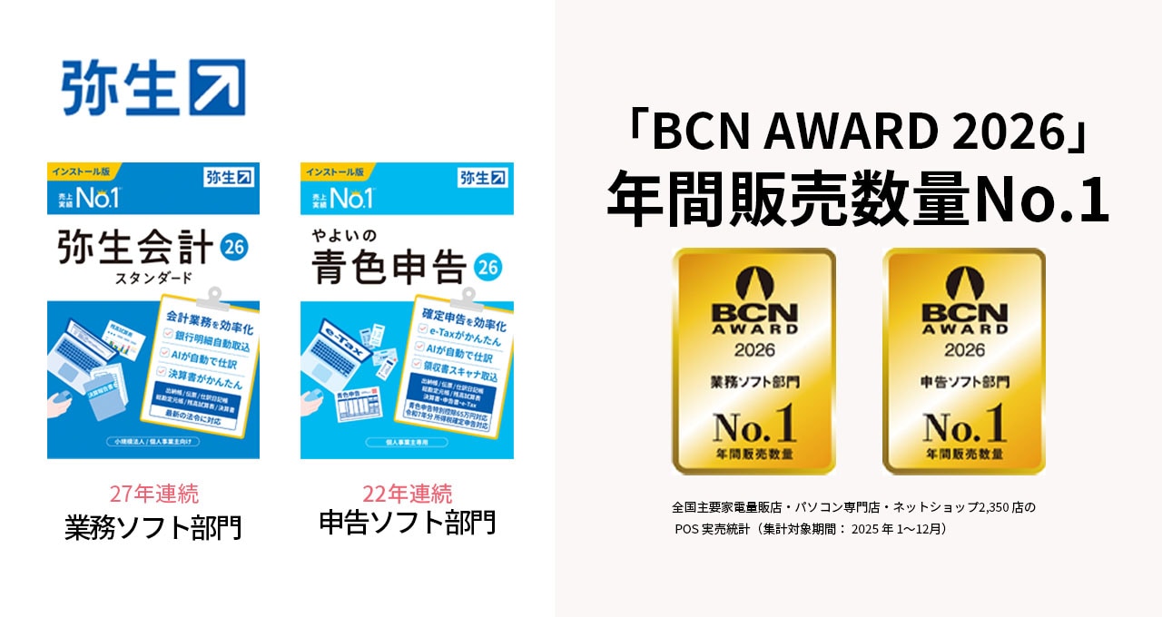 このたび「BCN AWARD 2026」において、「弥生会計(業務ソフト部門)」「やよいの青色申告(申告ソフト部門)」が2025年の年間販売数量No.1※1を受賞いたしました。