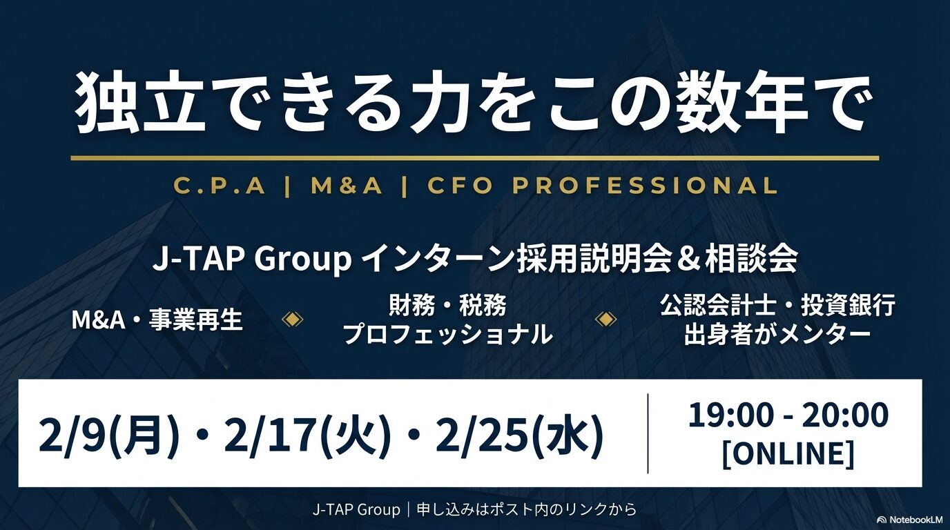 J-TAP Groupは、「独立できる力をこの数年で」を合言葉に、CFO人材を多数輩出するリーディングファームを目指す企業です 。公認会計士・税理士のほか、投資銀行や事業再生コンサル出身者、弁護士など多様なバックグラウンドを持つ少数精鋭のメンバーで構成されており、M&A・事業再生・税務などプロフェッショナルサービスを提供しています 。