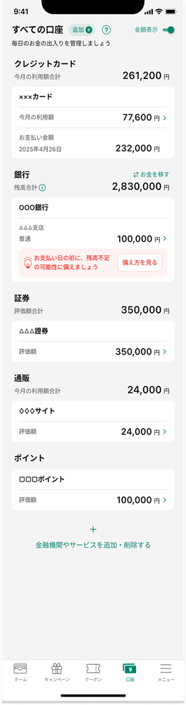 ・『マネーフォワード ME』に連携されている金融関連サービスの資産情報を口座一覧画面に表示する機能