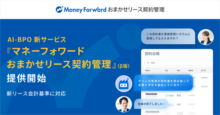 株式会社マネーフォワードは、新たにAI-BPOサービス『マネーフォワード おまかせリース契約管理』(β版)の提供を開始しました。リース契約管理業務における業務設計から実務運用部分までAIと専門オペレーターが包括的に代行し、リース契約管理業務の負担削減とバックオフィスの人手不足解消に貢献します。
