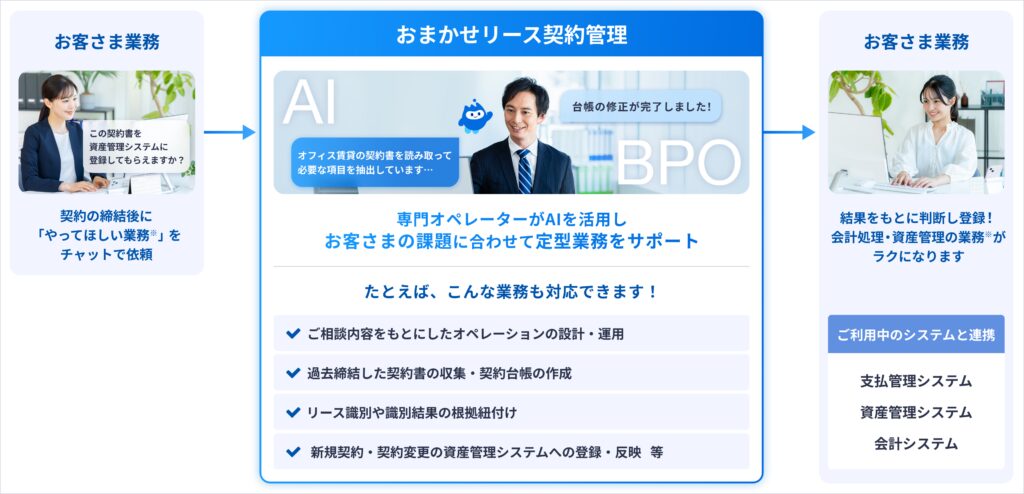 当社はこれまで、新リース会計基準に対応するAIエージェントやプロダクトを提供してまいりました。しかし、契約の棚卸しやデータ入力作業、複雑なリースの判定基準などにおいて、人材不足が多くの企業で根本的な課題となっていることがわかりました。こうした背景から、当社はリース契約管理業務全体を、AIと人の協働により、包括的にアウトソーシングできるAI-BPOサービスの提供を開始します。