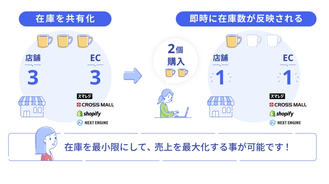売れた瞬間に在庫が全チャネルで自動更新されるため、手入力の転記ミスや売り越しリスクを解消し、攻めの店舗運営を実現します。