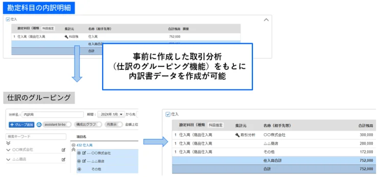 特に、勘定科目内訳明細書については、補助科目や取引先を管理していない場合でも、bixid内に存在する仕訳のグルーピング機能を活用することで、内訳集計の効率化に寄与することが可能です。
